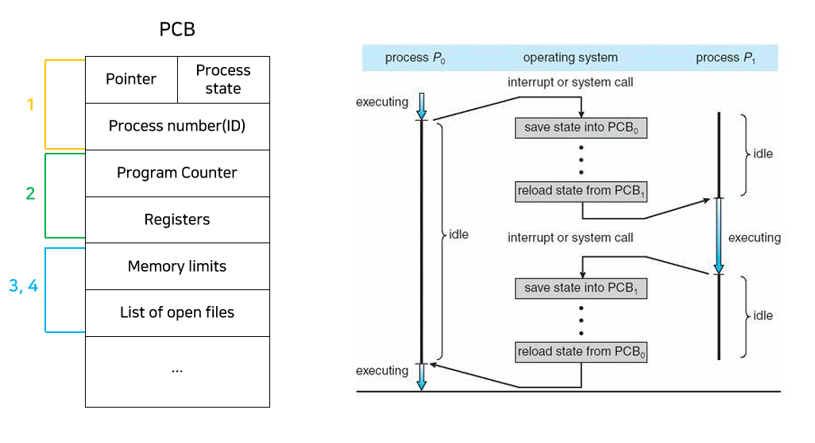 프로세스가 실행되다가 인터럽트가 발생해 CPU를 한 프로세스에서 다른 프로세스로 넘겨주는 과정이다. 운영체제는 CPU를 내어주는 프로세스의 상태를 PCB에 저장하고 CPU를 새롭게 얻는 프로세스의 상태를 PCB에서 읽어온다. 즉, CPU 입장에서 Context는 PCB이기 때문에 PCB 정보가 바뀌는 것이 Context Switch다.